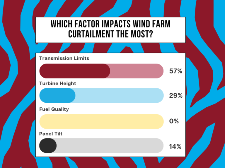 Last month, we asked our audience: Which factor impacts wind farm curtailment the most? Overall, the most voted answer was Transmission Limits, with 57 percent of the vote. In second place, Turbine Height received 29 percent. In third place, Panel Tilt received 14 percent of the vote. Finally, Fuel Quality received zero percent of the vote.