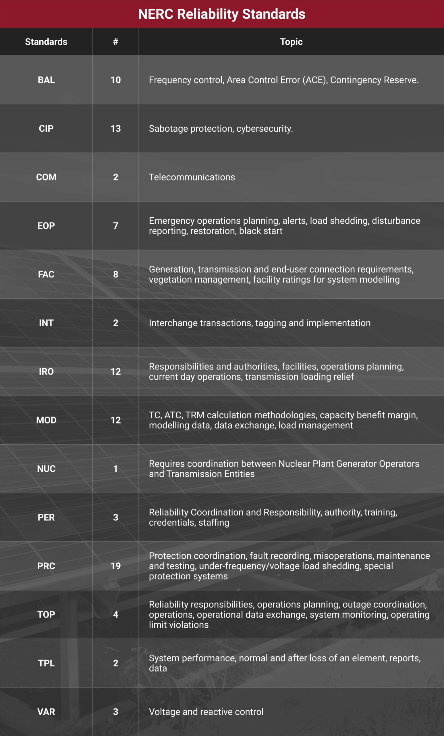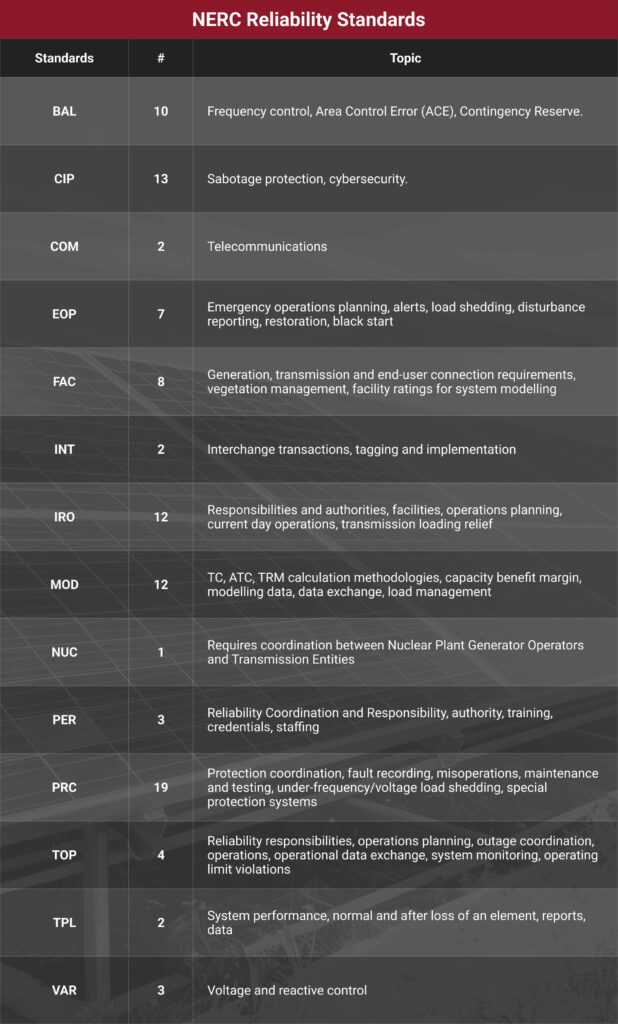 The North American Electric Reliability Corporation’s (NERC) Reliability Standards define the requirements for planning process and operations of the Bulk Electric System (BES). These standards are subject to enforcement within the United States and parts of Canada and Mexico. Reliability Standards establish threshold requirements for assuring the Bulk Electric System is planned, operated, and maintained to minimize risks of cascading failures, avoid damage to major equipment, or limit interruptions of the Bulk Power System (BPS).